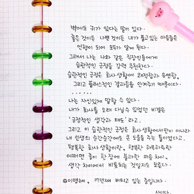 벽에도 귀가 있다는 말이 있다. 좋은 것이든 나쁜 것이든 내가 품고 있는 마음들은  언행이 되어 모두가 알게 된다. 그래서 나는 나와 같은 직장인들에게  습관적인 긍정을 강력 추천한다. 습관적인 긍정은 회사 생활에 쾌적함과 유연함, 그리고 플러스적인 결과들을 안겨주기 때문이다. ...... 나는 자신있게 말할 수 있다. 내가 회사를 오래 다닐 수 있었던 비결은 '긍정적인 생각과 태도'라고. 그리고 이 습관적인 긍정은 회사 생활에서만이 아니라  내 인생의 순간순간에도 큰 도움을 주는 툴이었다고. . 행복한 회사 생활이란, 행복한 하루하루란  어쩌면 종이 한 장에 불과한 마음 차이, 생각 차이에서 비롯되는 것일지도 모른다. ⓒ 이명혜, 17년째 버티고 있는 중입니다. 사이다 출판.